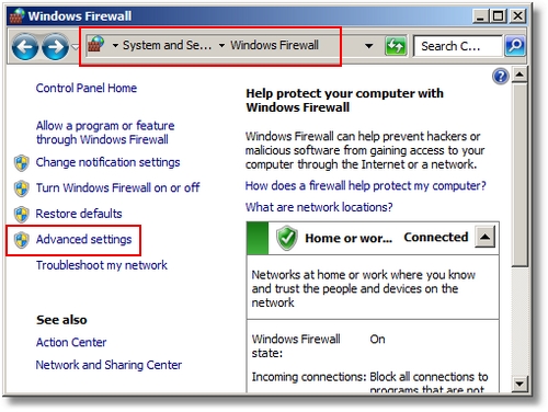 The following procedure can be used to add a firewall exception for the Whozz Calling?™ CallerId box or PCCharge Payment Server. To add a firewall exception in Windows 7, open the Control Panel > Windows Firewall applet. Click Advanced Settings. Note that manually creating an exception is normally not required for PCCharge Payment Server, as Windows will prompt you to add an exception automatically the first time PCCharge Payment Server attempts a network connection.