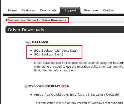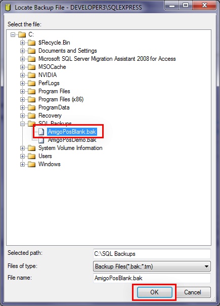 1. Download the SQL Database backup from the drivers and utilities download page at http://www.amigopos.com. The database is available with or without demo data. The database without demo data has no menus and only one employee with manager permissions and login id #2. Unzip the database backup to a folder on the root drive, i.e. C:\SQL Backups.