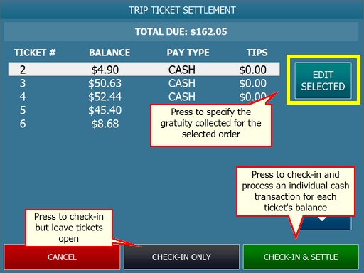 Gratuities can be specified for each order by selecting the order and pressing the EDIT SELECTED button. Note that this function is available for cash transactions only, as non-cash gratuities are entering when processing the payment on the settle screen or when capturing a credit card transaction. If gratuities are not tracked, set Driver Check In Edit Disable to Yes so that the EDIT SELECTED button is hidden.