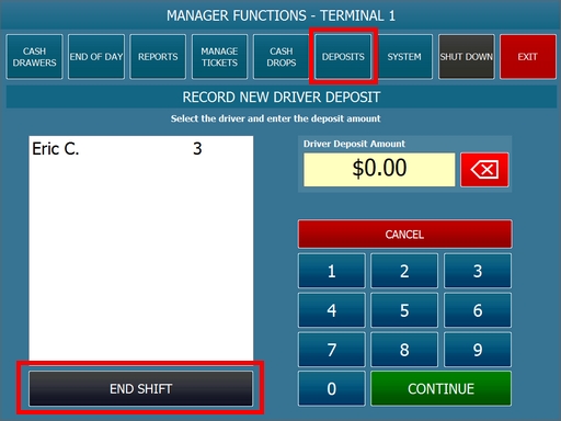 Drivers may periodically deposit cash into the drawer in order to reduce the amount of cash that they carry. The manager must accept the deposit and record it on the manager screen by pressing the Deposits button at the top followed by the Driver Deposit button. Press the New Deposit/End Shift button. Select the driver, enter the deposit amount and press the green Continue button to open the cash drawer.