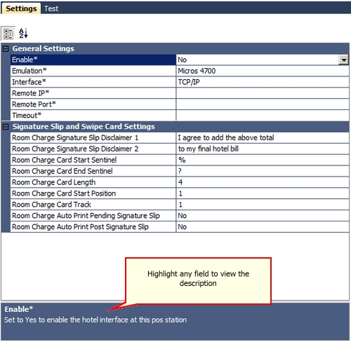 Enable*: Set to Yes to enable the hotel interface at this pos station
