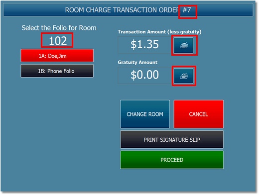 Confirm that the correct folio is selected. The first folio on the list is selected by default, as it is the most common for restaurant charges. The guest may have additional folios for phone charges, mini-bar, etc also listed. The amount is filled in with the current balance due on the order and can be changed if necessary. If gratuities are in use or a signature slip is required, press the print signature slip button so that the customer can specify the gratuity and total. The preliminary signature slip has no effect on the order's balance due and the screen can be closed and opened at a later time to run the transaction again. If a signature slip is not required, verify that the gratuity amount is correct and press the green button to continue. Note that the signature slip will print automatically after the folios are retrieved if the Room Charge Pending Signature Slip setting is set to Yes.