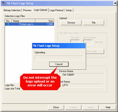| 5. | The logo can now be uploaded to the printer. Select the Logo Upload tab and click the Device button. The upload will begin automatically. Do not interrupt the process or an error will result. |