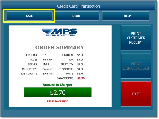 Depending on the type of processing that is configured in Back Office, the top left button will display either PRE AUTHORIZE or SALE. Press the button to continue.