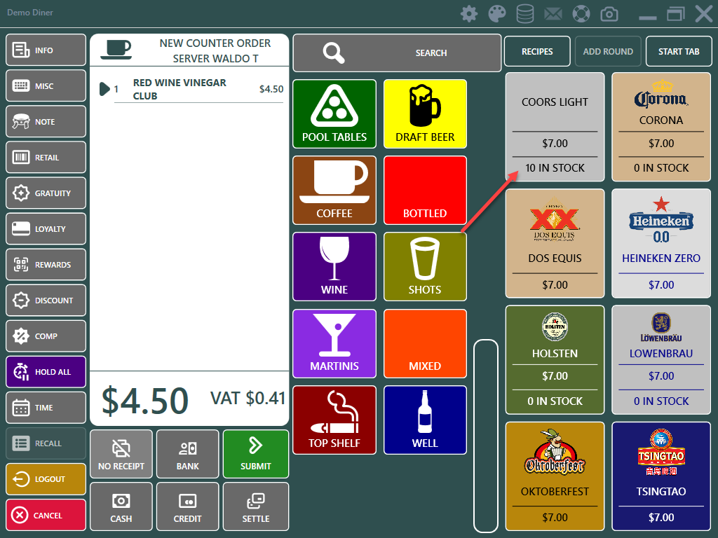 Added the option to display the in stock quantity for regular and bar menu items where the menu item recipe contains only one inventory item.