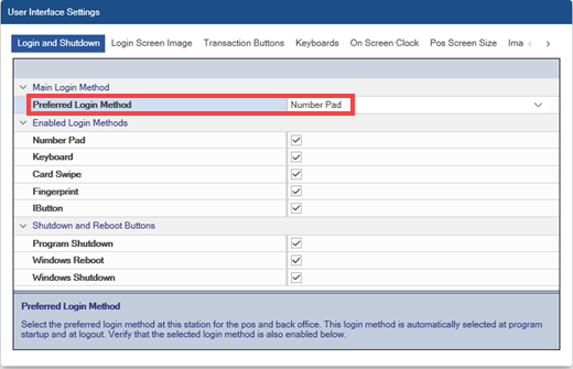 Added setting to set the default login method at each pos station in back office | settings | main settings | user interface.