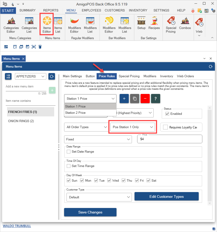Added price rule pos station option so that the default menu item price can be overridden at any or all pos stations.