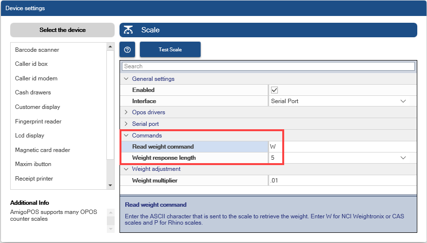 Added the option to set the read weight command and response length for serial port scales so that additional scales such as the Rhino BAR-9.