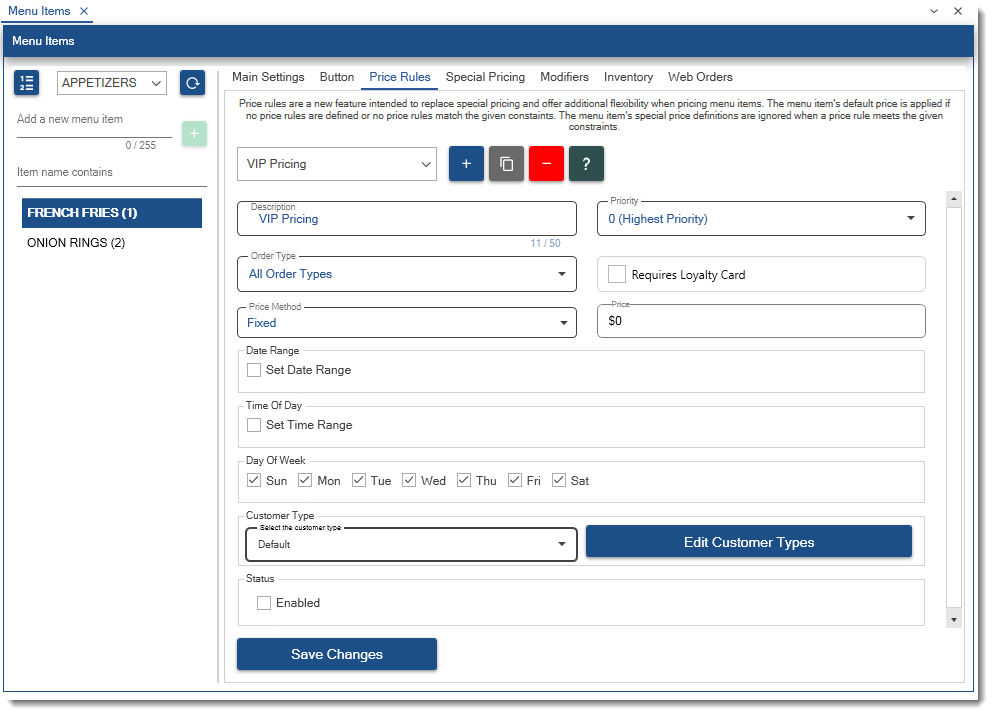 Added menu item price rules to override the menu item's regular price based on rules including order type, date range, time range, day of week and customer type.