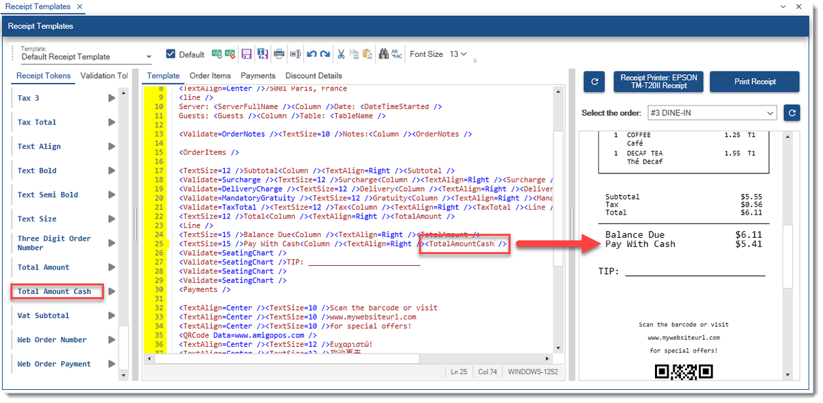 Added customer receipt template <TotalAmountCash /> tag to include the cash discount in the order total. This tag is used only when a discount is defined for the cash payment method.