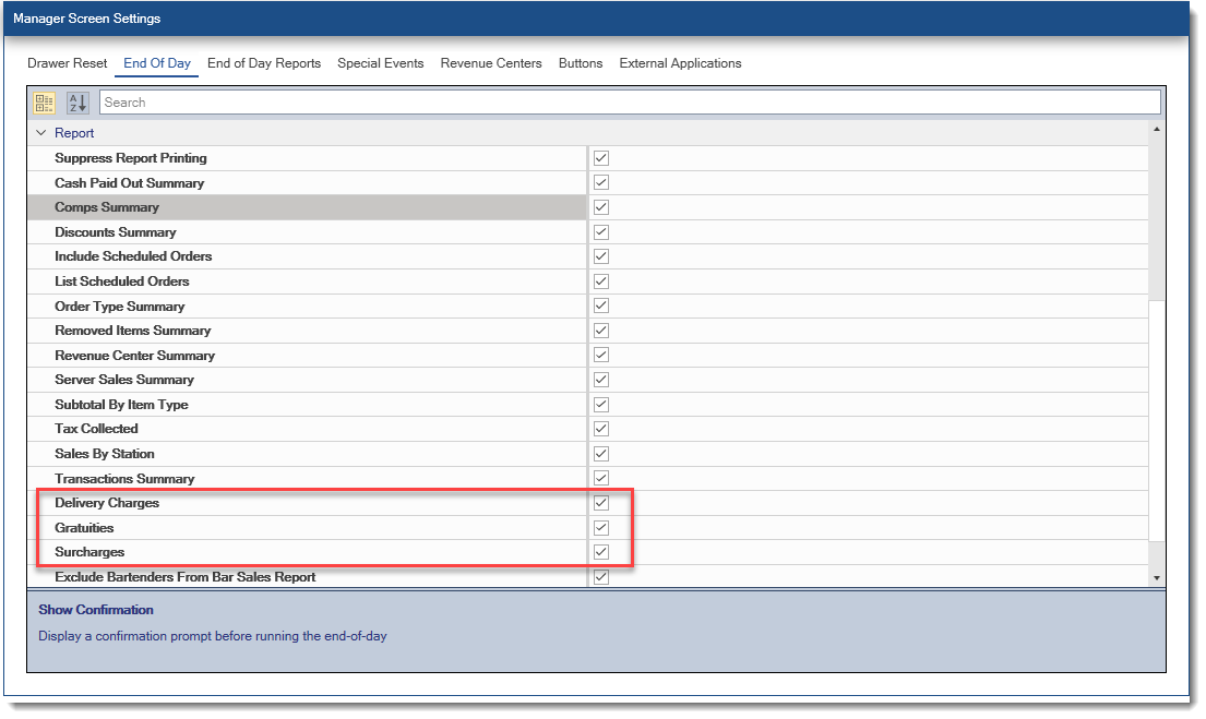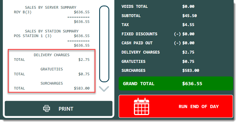 Added option to print delivery charges total, mandatory gratuities total and surcharges total on end of day report