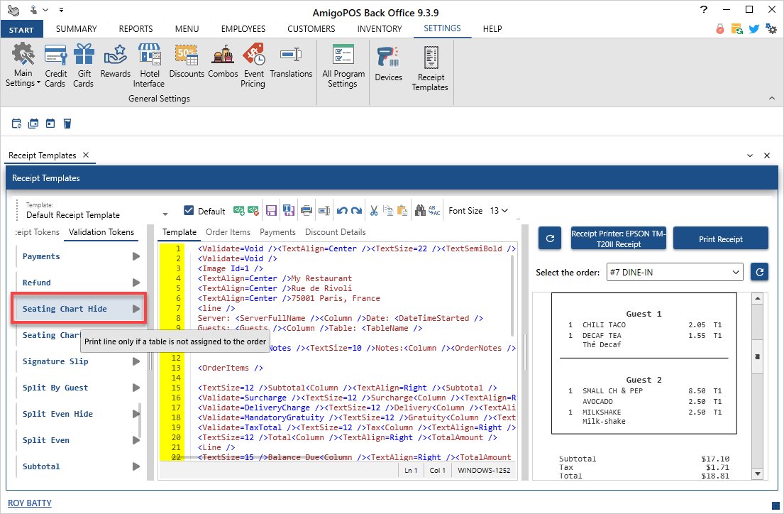 Added customer receipt template SeatingChartHide validation token to suppress the line for orders where a seating chart table is assigned