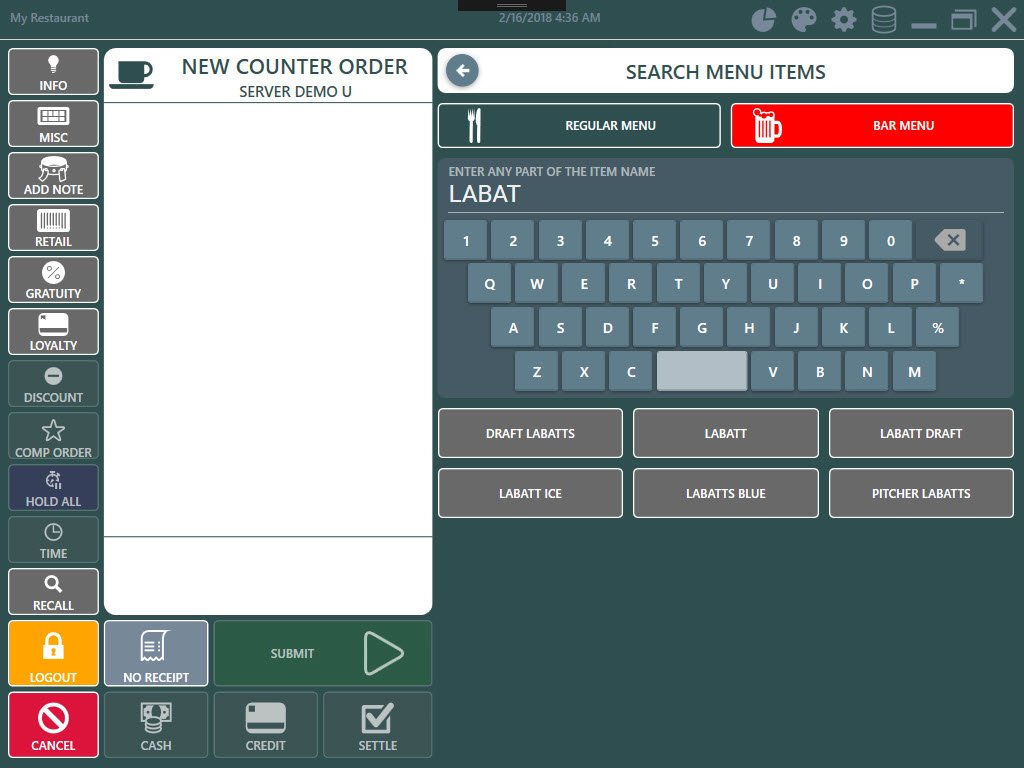 Added order entry screen search button to quickly filter the regular and bar menus by item name