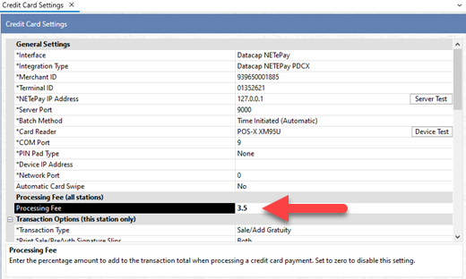 Added the option to charge a credit card processing fee where a percentage surcharge is applied to all Sale and Adjust (Add Gratuity) credit card transactions.