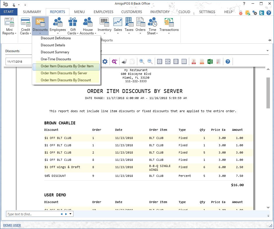Added 3 additional full size discount reports for order item discounts grouped by order item name, server and discount name