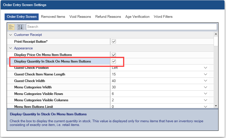 Added the option to display the in stock quantity for regular and bar menu items where the menu item recipe contains only one inventory item.