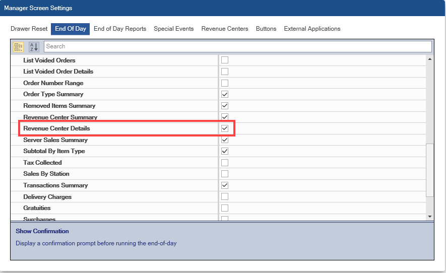 Added revenue center details subreport to end of day report. The subreport can be enabled in back office | settings | main settings | manager screen | end of day.