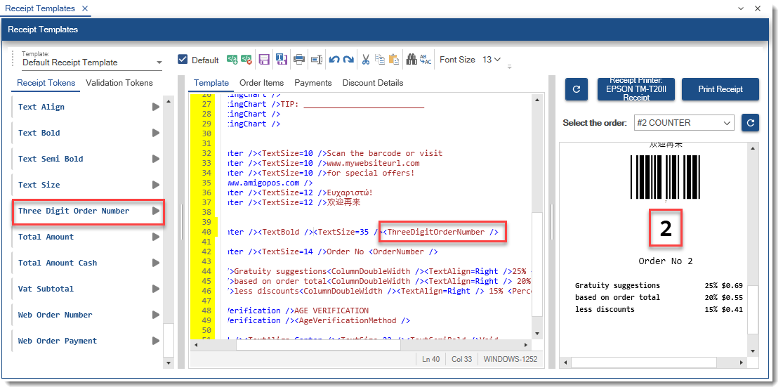 Added customer receipt template <ThreeDigitOrderNumber /> tag to print the last three digits of the order number. Normally used with the prep ticket 3 digit order number to facilitate fast food counter orders.