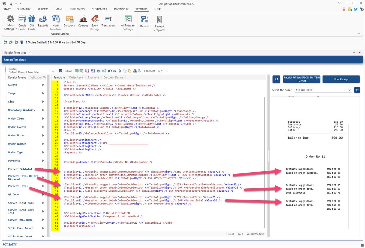 Added customer receipt template PercentSubtotal tag for suggested gratuity calculations so that the suggested gratuity is calculated before the discount, surcharge, mandatory gratuity, etc are applied