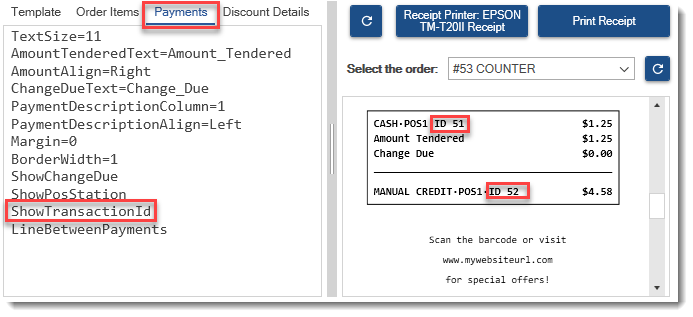 Customer receipt payments template includes the ShowTransactionId option to print the transaction id on the payment description line