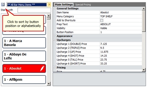 Most users will find it useful to modify the existing bar menu included with Amigo Pos 7. The default menu includes most common bar menu categories and items with various combinations of upcharge levels, special pricing, button sizes, images, and other customizations that demonstrate most common features.